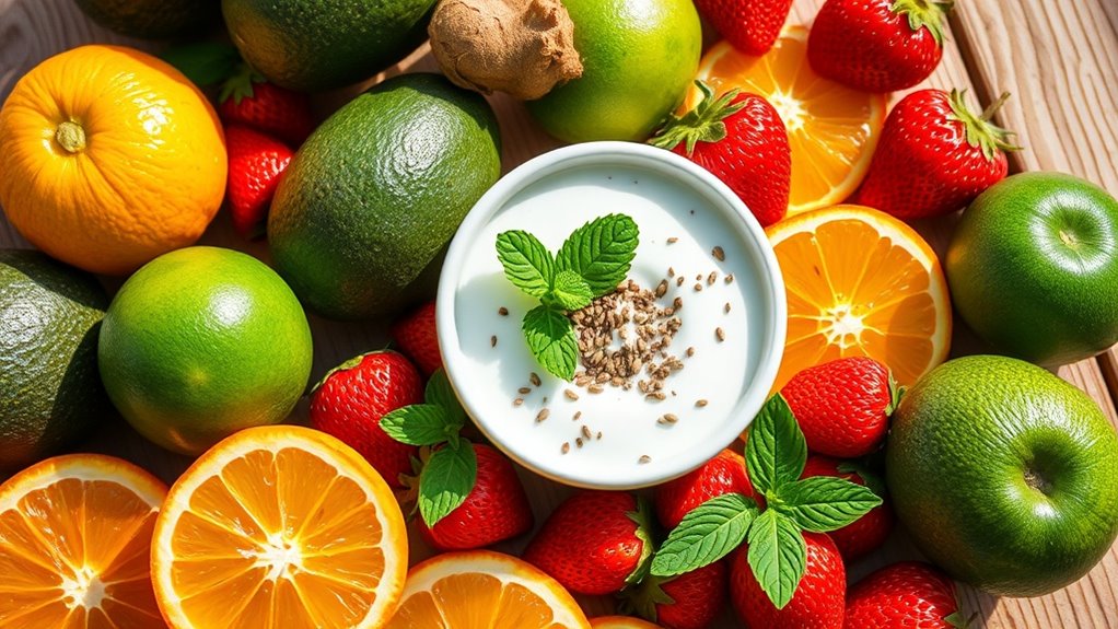 When you’re looking to enhance your skin’s natural glow, incorporating berries into your diet is a delicious and effective choice. Rich in antioxidants like vitamin C and flavonoids, berries help combat free radicals, reduce inflammation, and improve skin hydration. Additionally, their high fiber content supports digestion and contributes to reducing bloating, which can further enhance your overall appearance. Choose strawberries, blueberries, or raspberries for a potent boost. Enjoy them in smoothies or as snacks for beautiful, glowing skin this spring!